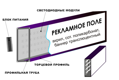 Рекламные световые короба – это, по сути, вывеска с подсветкой изнутри. Внутренняя подсветка делает вывеску ярче и заметнее. Лицевое рекламное поле светового короба может быть из разных материалов: сотовый поликарбонат, акрил или орг. стекло, и даже транслюцентный баннер. Транслюцентным он называется потом, что он рассеивает свет по своей площади.
